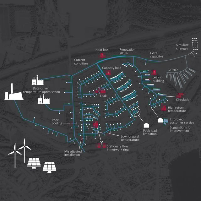 Et af disse værktøjer er Kamstrups Heat Intelligence – en webbaseret analyseplatform designet til at levere indsigt i dit forsyningsnetværk, som du kan handle på. Heat Intelligence kombinerer GIS-data om f.eks. rørlængde, dimension og isolering med målerdata, sådan at det kan beregnes, hvordan varmen bevæger sig i forsyningsselskabets netværk, og hvad det betyder for varmeforsyningen. Herudover kan modellen estimere de faktisk forhold i netværket (fx for brug, temperaturer eller tryk) hvilket kan anvendes til både fejlfinding, produktionsplanlægning eller indgå i renoveringsplaner.