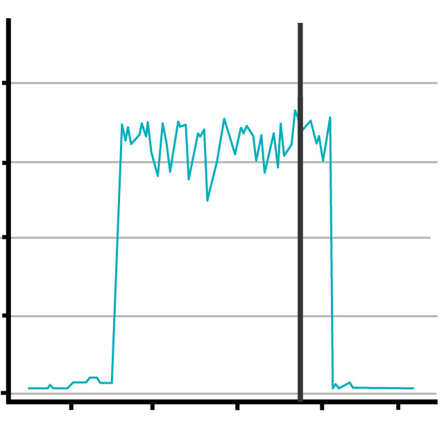 Leckagen in Anschlussleitungen können für viele Versorgungsunternehmen eine Blackbox sein. Es erfordert viel Zeit und Aufwand, um sie aufzuspüren. Während des Projekts entdeckten wir mehrere Leckagen in Anschlussleitungen. Das Beispiel unten zeigt eine rasche Zunahme der akustischen Werte. Zu diesem Spitzenwert kam es direkt nach der Installation des flowIQ® 2200, und sofort wurde eine Leckage erkannt. Der graue Balken am Ende der Wasserleckage gibt die Zeit an, wann sie entdeckt wurde. Kurz nachdem sie repariert wurde, fiel der Wert wieder auf Normalniveau.