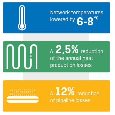 Bei den Fernwärmeversorgern, die unser Fernauslesesystem READy und die Analyseplattform Heat Intelligence verwenden, lassen sich klare und messbare Ergebnisse erkennen. Dazu zählen eine Reduktion der Leitungsverluste um 12 %, eine Senkung der Temperaturen im Netzwerk um 6 - 8 Grad und eine Reduktion der jährlichen Wärmeproduktion um 2,5 %. Das führt insgesamt zu erheblichen Einsparungen und einer höheren Wettbewerbsfähigkeit.