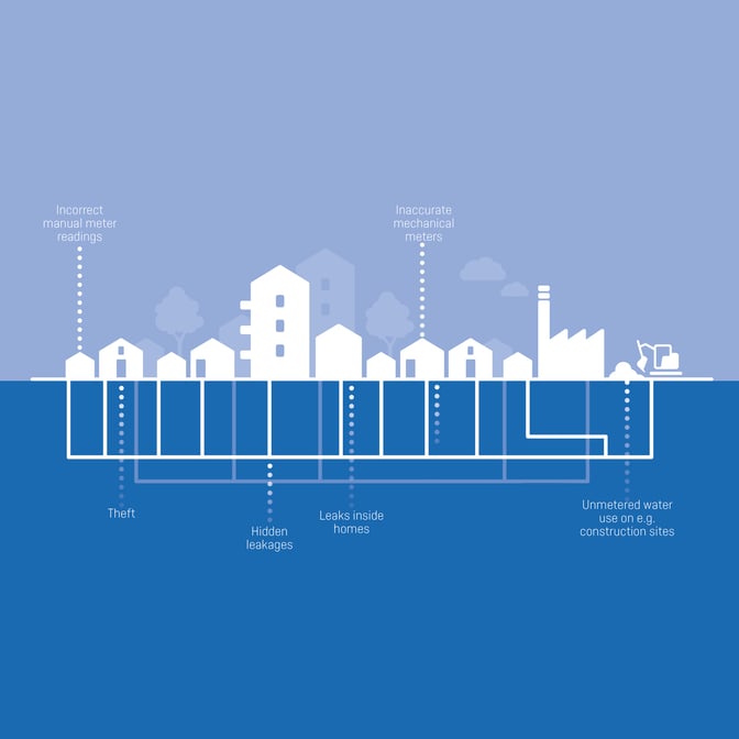 Non-Revenue Water is many things. And in order to reduce your NRW, you need access to the right information at the right time. Luckily, smart metering creates transparency in your network and helps you locate and neutralise different kinds of Non-Revenue Water. With it, you can learn where your biggest water losses are and get help to prioritise your efforts and focus in the future.