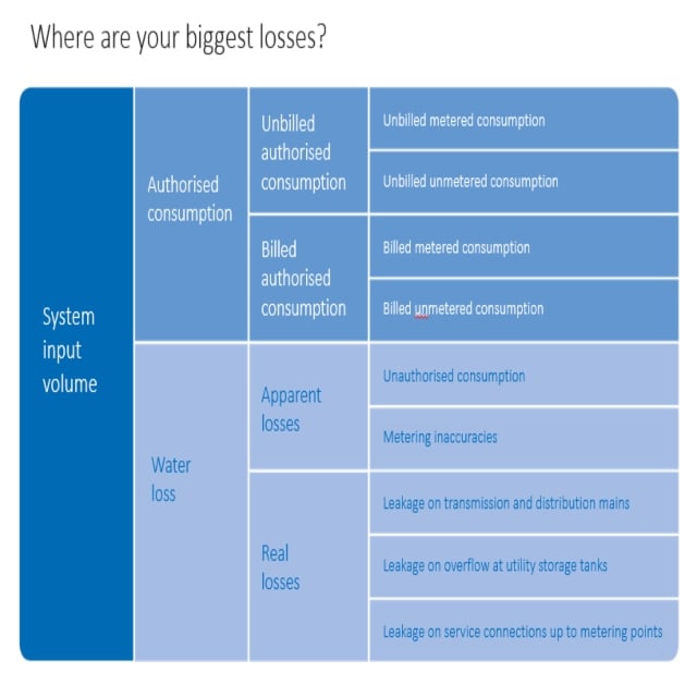Apparent losses and real losses. When your water loss is caused by unauthorized consumption or metering inaccuracies it can be categorised as apparent losses. Whereas we talk about real water losses when it is caused by e.g. leakages in different places.