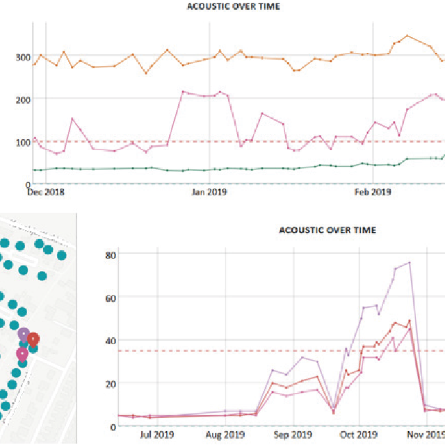 Our initial test showed that many leaks can only be detected by the nearest meter. However, in some cases, multiple meters detect the leak. This is often seen as very similar noise graphs (Figure 4 bottom panel). The similarity rises as the sensors register the same noise source and are mostly seen in metal-based pipes, where the noise can travel far, or for leaks on the mainline where the noise source is close to multiple sensors.