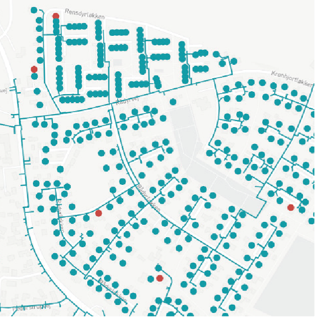 Map showing the locations of water meters equipped with an acoustic noise sensor. A red dot means that the noise level is high, and the reason could be a leak. Data is by curtesy of VandCenter Syd.