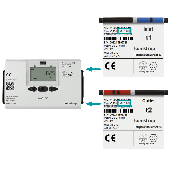 The latest generation of Kamstrup cooling meters comes with a novel feature called “temperature offset”. As part of the European standard EN1434 for thermal energy meters each temperature sensor is measured at various temperatures before the pairing with a second temperature sensor is performed. The offset explained in the above figure is therefore easy to determine based on these measurements and is subsequently added to the cooling meter. The result is a cooling meter where the inlet and outlet temperature is measured with an accuracy of ± 0.1 K. With the new Kamstrup TemperatureSensor 63 the calculated temperature offset is also written on the label of the temperature sensor making the offset value transparent for everyone and easy to insert in the meter if some reason the temperature sensors must be changed.
