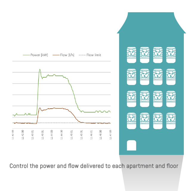 Here, an example of Cooling application showing the power and flow is adjusted back to the specified set point within 3 minutes, ensuring enough cooling energy is available for each chiller/apartment/tenant.