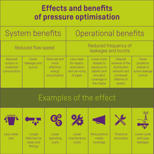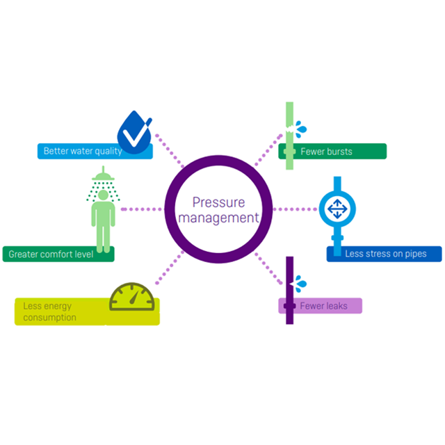 Continuous management of the water pressure in the distribution network gives both utilities and the consumers several financial and comfort benefits. For the utility, the improvement also includes better asset management and risk management. By delivering a water pressure at the consumer that does not vary significantly despite changes in consumption over time, the utility can proactively