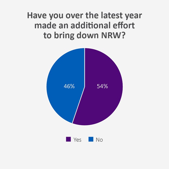 With the increase in attention towards sustainability brought on by, among other things, the SDGs, Non-Revenue Water is a topic the most water professionals have come across and it is something that most utilities work actively towards reducing. 54% of the utilities in the survey say that they have made additional efforts to lower their water loss, and almost all participants rate NRW reductions 5 or above on a scale of 1-10 with 10 representing the highest importance.