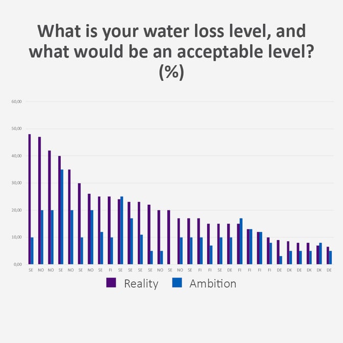 The NRW levels among the participating utilities varied greatly from just below 50% to around 6%, and almost all of the utilities have the ambition of lowering their current water loss. The big difference in water loss levels can be explained by a number of things such as current solutions, state or age of distribution network and legislative framework. As one example, utilities in Denmark are fined if their water loss exceeds 10% which has spurred increased investments and efforts into bringing the NRW down.
