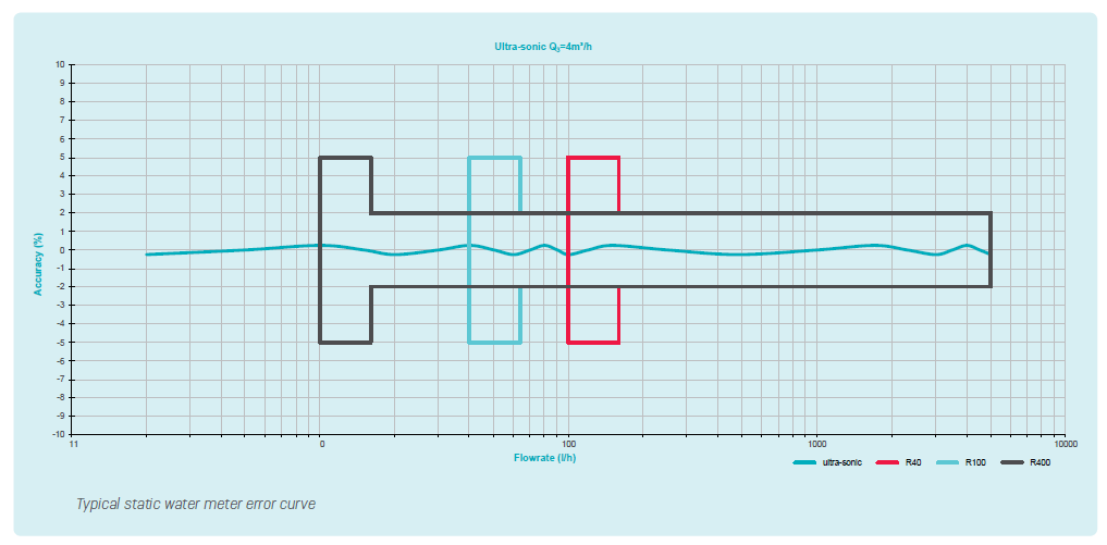 Por lo tanto, para evaluar la precisión de manera justa, mire más allá del rango dinámico y también tenga en cuenta el caudal de arranque, la precisión dentro del margen de error máximo permitido y la técnica de medición. En Kamstrup, el rango dinámico no es el enfoque principal durante el desarrollo y la producción de contadores de agua.