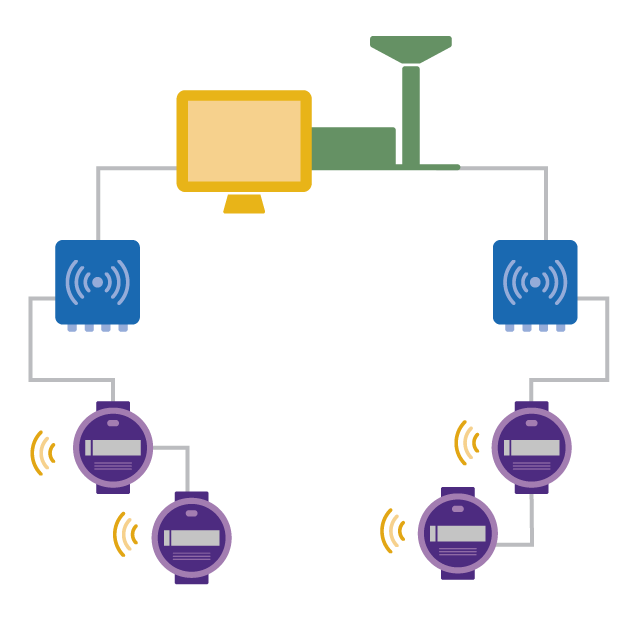 Un mismo sistema de lectura remota READy puede leer tanto contadores inalámbricos como otros contadores que estén conectados en una red M-Bus cableada. Por eso, READy es la solución de lectura ideal si desea disponer de ambas opciones o si dispone de distintos tipos de contadores y necesita un sistema que pueda leer M-Bus cableado y/o Wireless M-Bus.