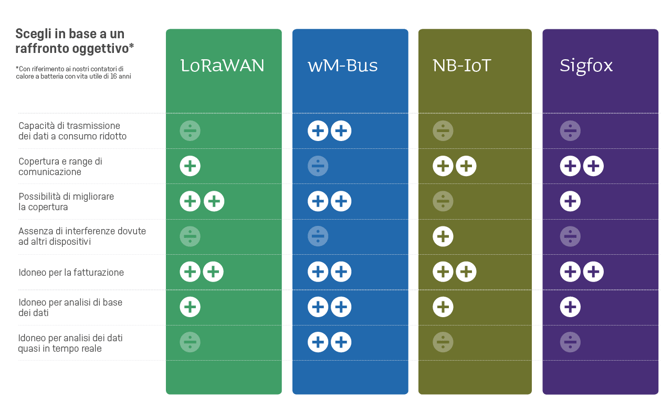Le tecnologie di comunicazione disponibili sono tante ma, in ogni caso, prima di fare una scelta è importante valutare le proprie esigenze. Il tuo obiettivo è ottimizzare il business per conservare la competitività della tua azienda? La tua prima priorità è fornire soluzioni all’altezza delle promesse? Vuoi essere in grado di individuare perdite e dispersioni termiche in tempo reale? Questi sono tutti aspetti da esaminare prima di scegliere tra le varie tecnologie di comunicazione disponibili. Se scegli un contatore di calore Kamstrup non sbagli mai, ma i vantaggi che ne potrai effettivamente trarre dipenderanno dalla tecnologia su cui deciderai di puntare.
