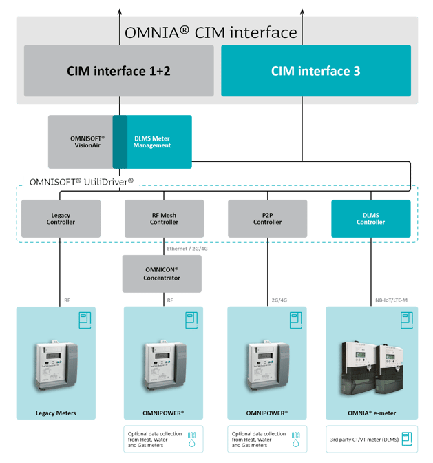 Våra nya e-meters kommunicerar med OMNIA® Suite över det mobila nätverket. Vi använder det standardiserade DLMS-protokollet och en DLMS-styrenhet för att integrera dem i ditt befintliga system.